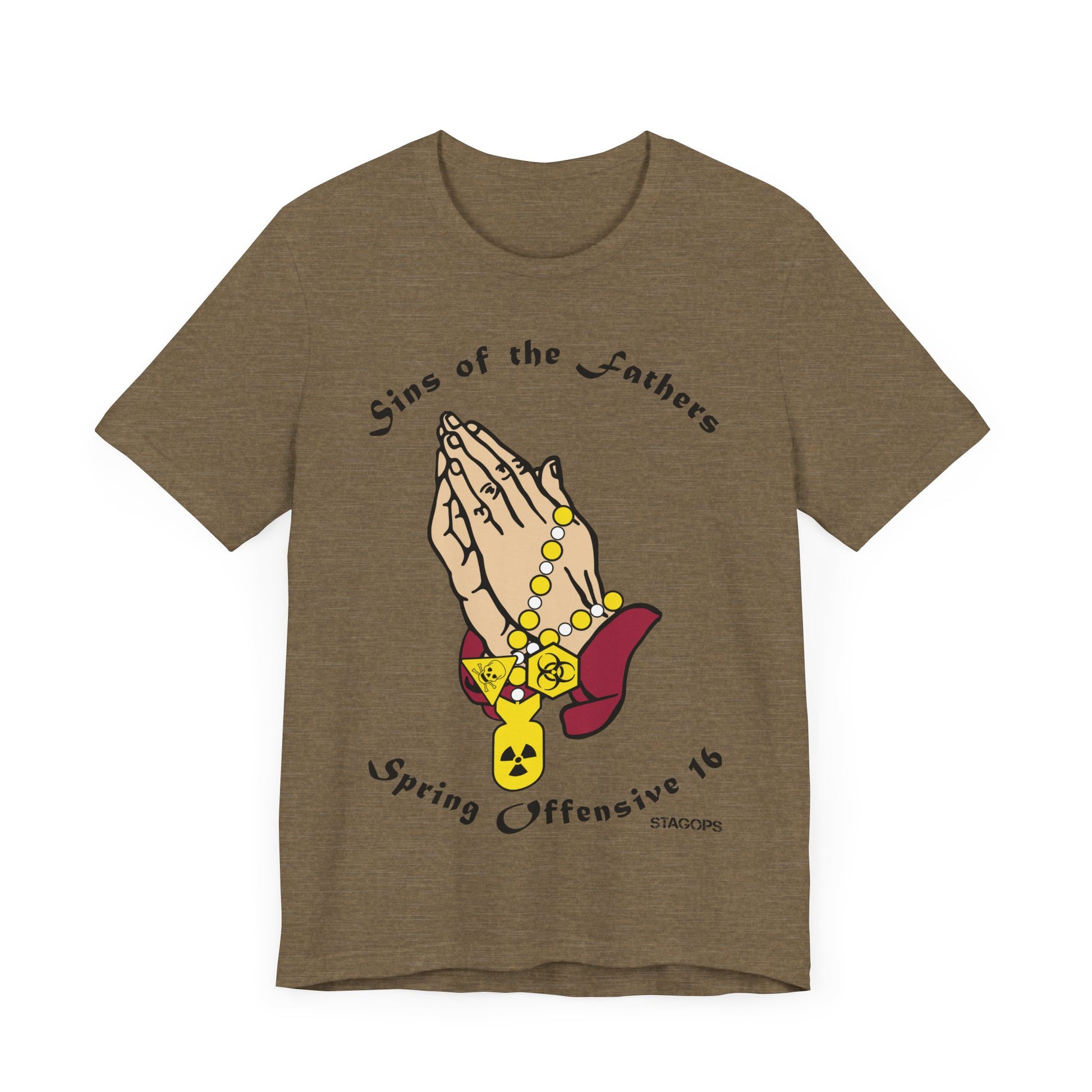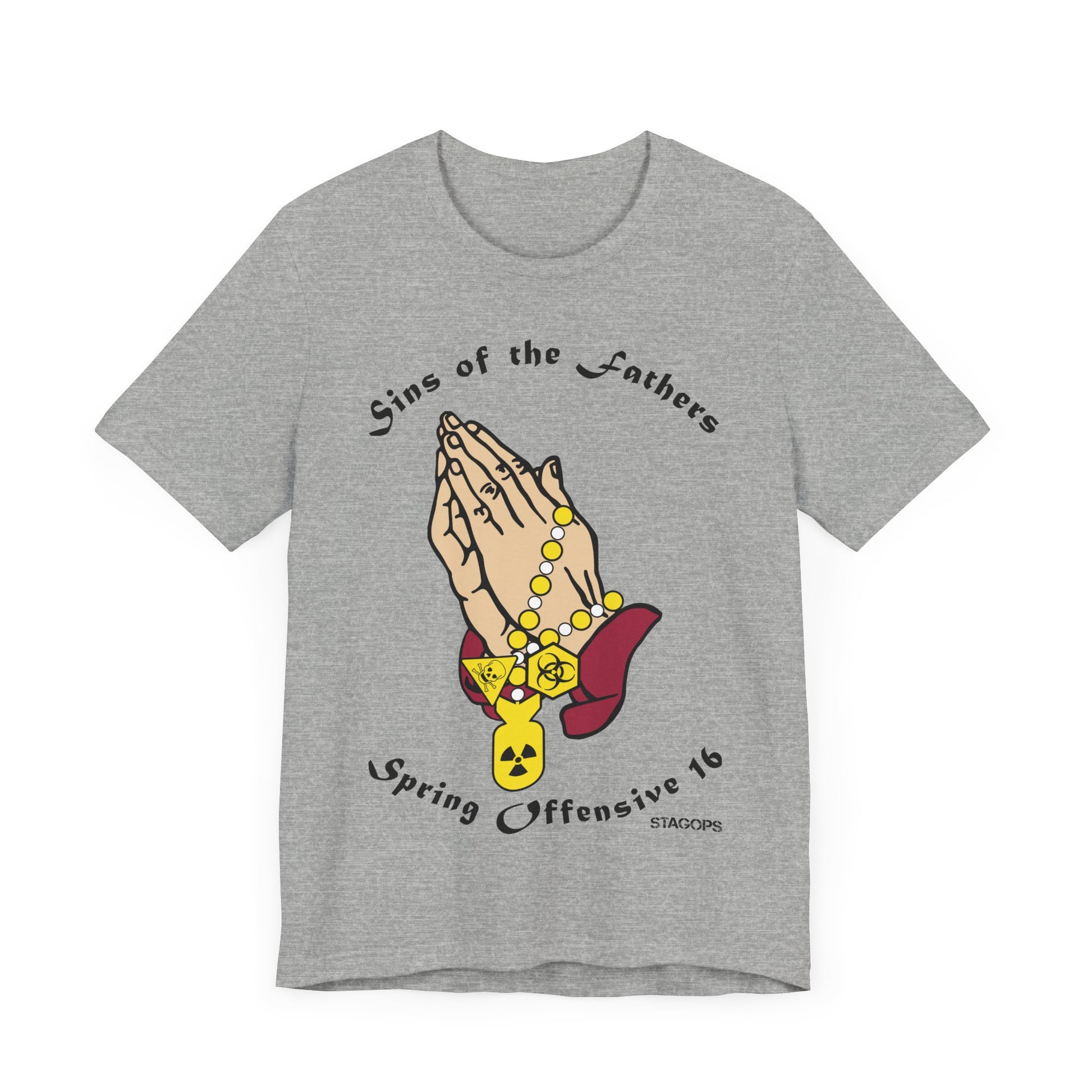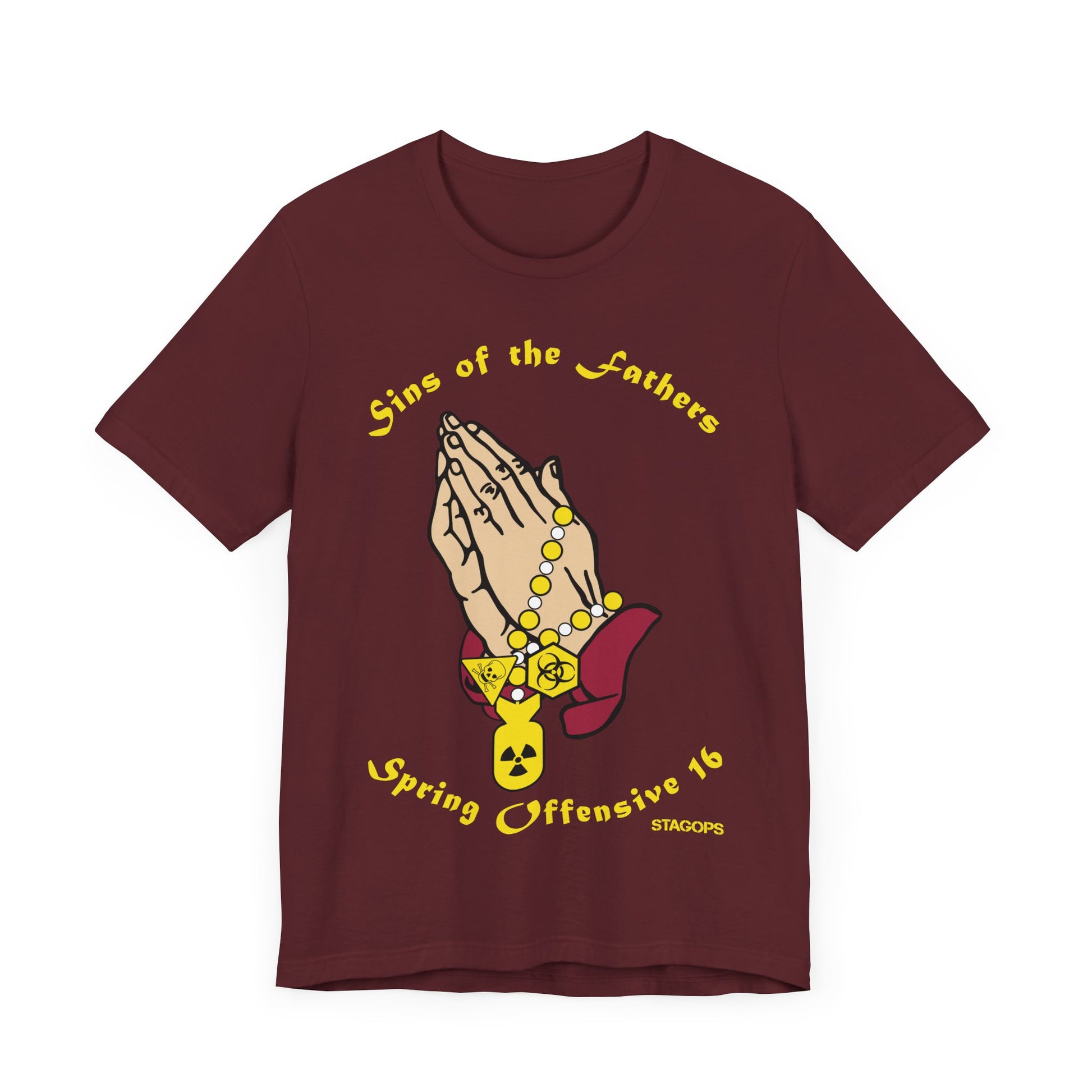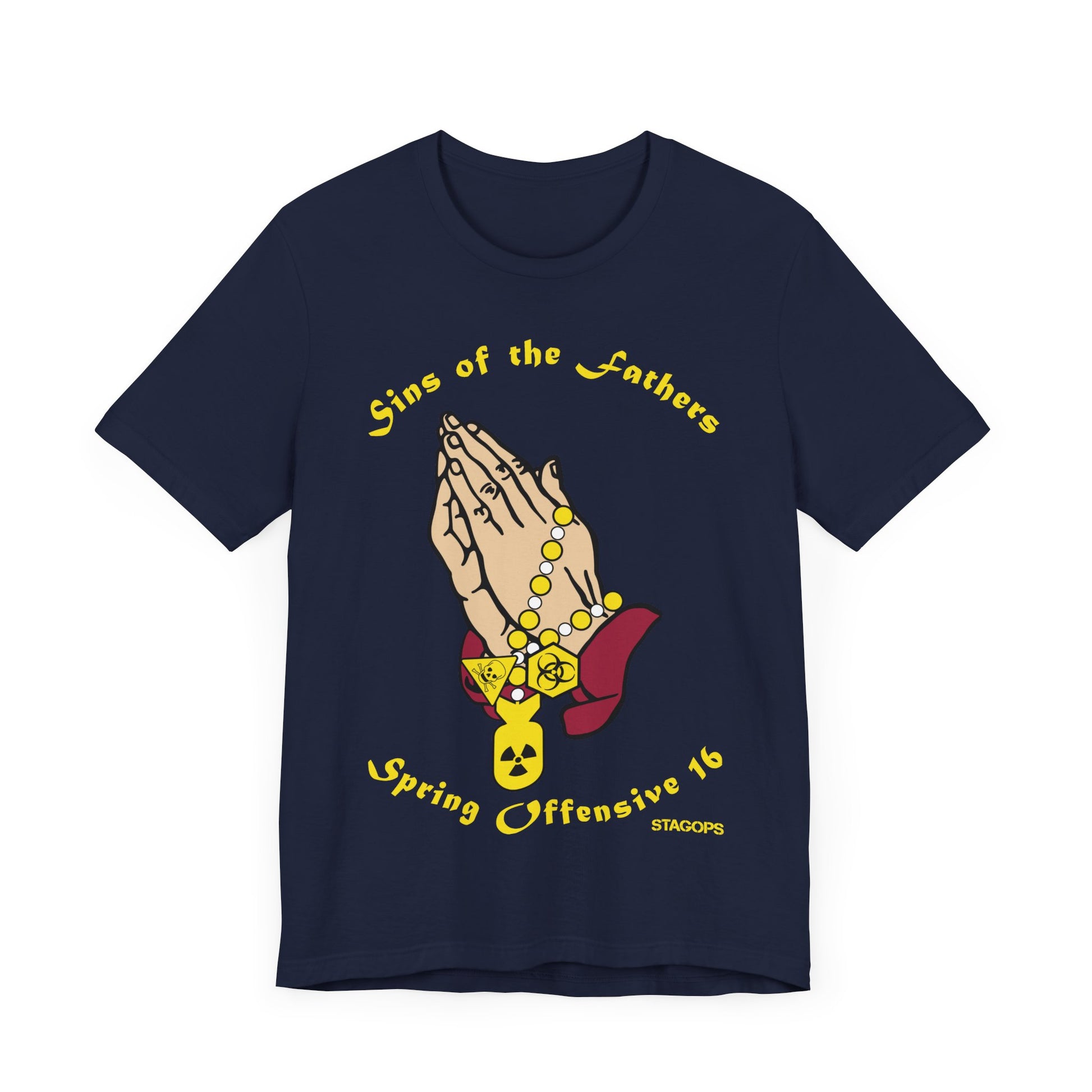 Celebrate our 18th year rocking unique airsoft events with the "Spring Offensive 16 "Sins of the Fathers" tee, available in both faction-uniform and casual colorways for your game day, range day, or just everyday wear.
