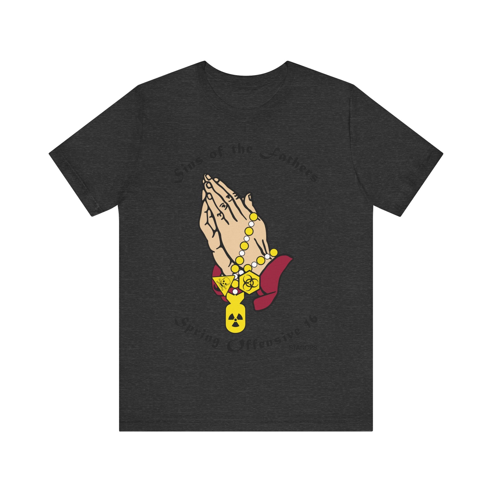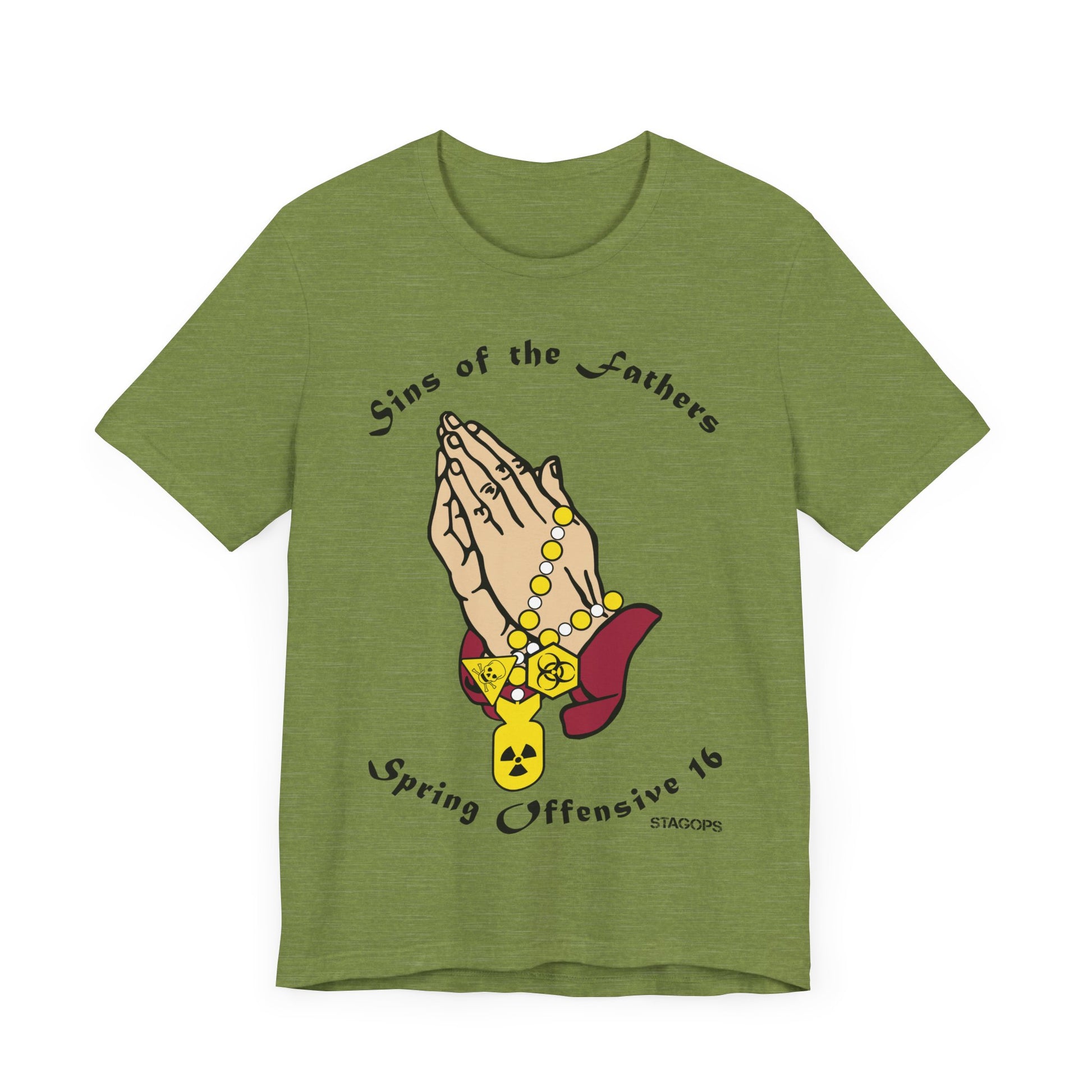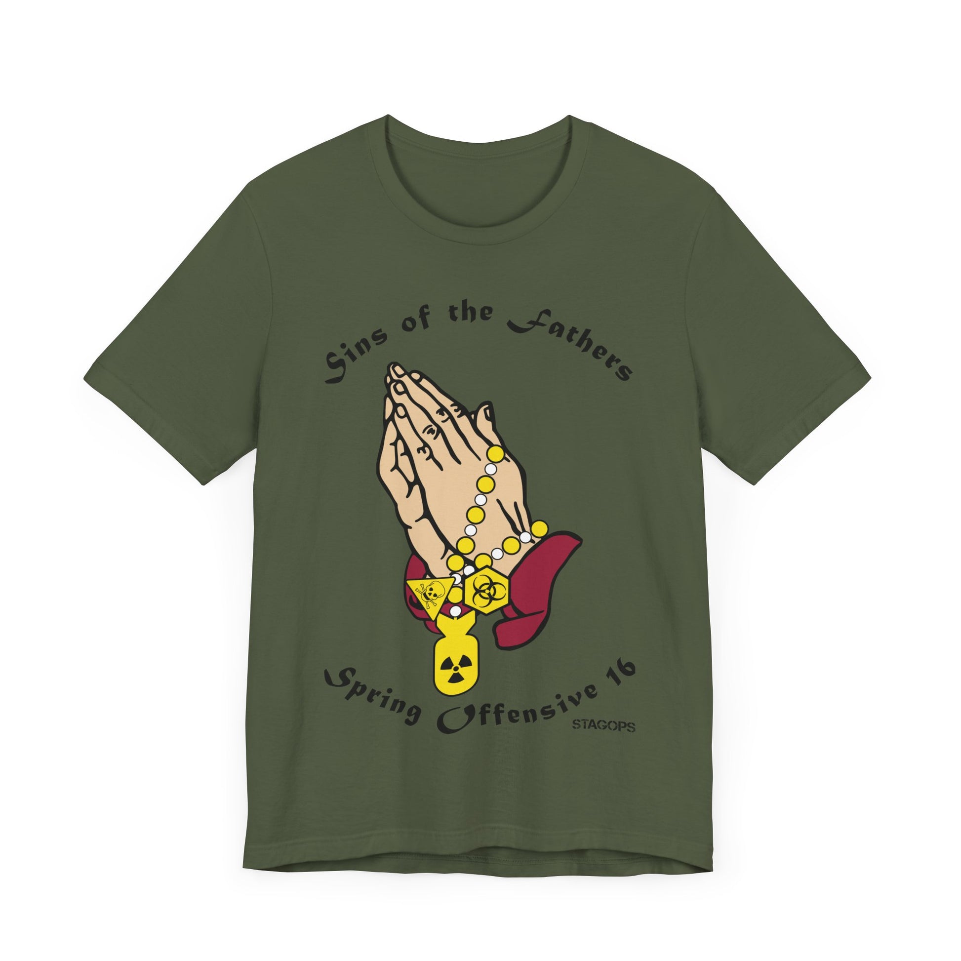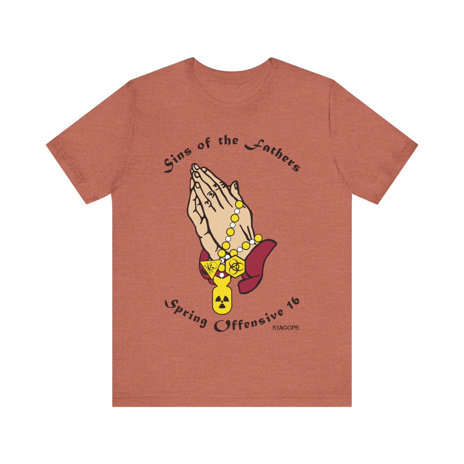 Celebrate our 18th year rocking unique airsoft events with the "Spring Offensive 16 "Sins of the Fathers" tee, available in both faction-uniform and casual colorways for your game day, range day, or just everyday wear.